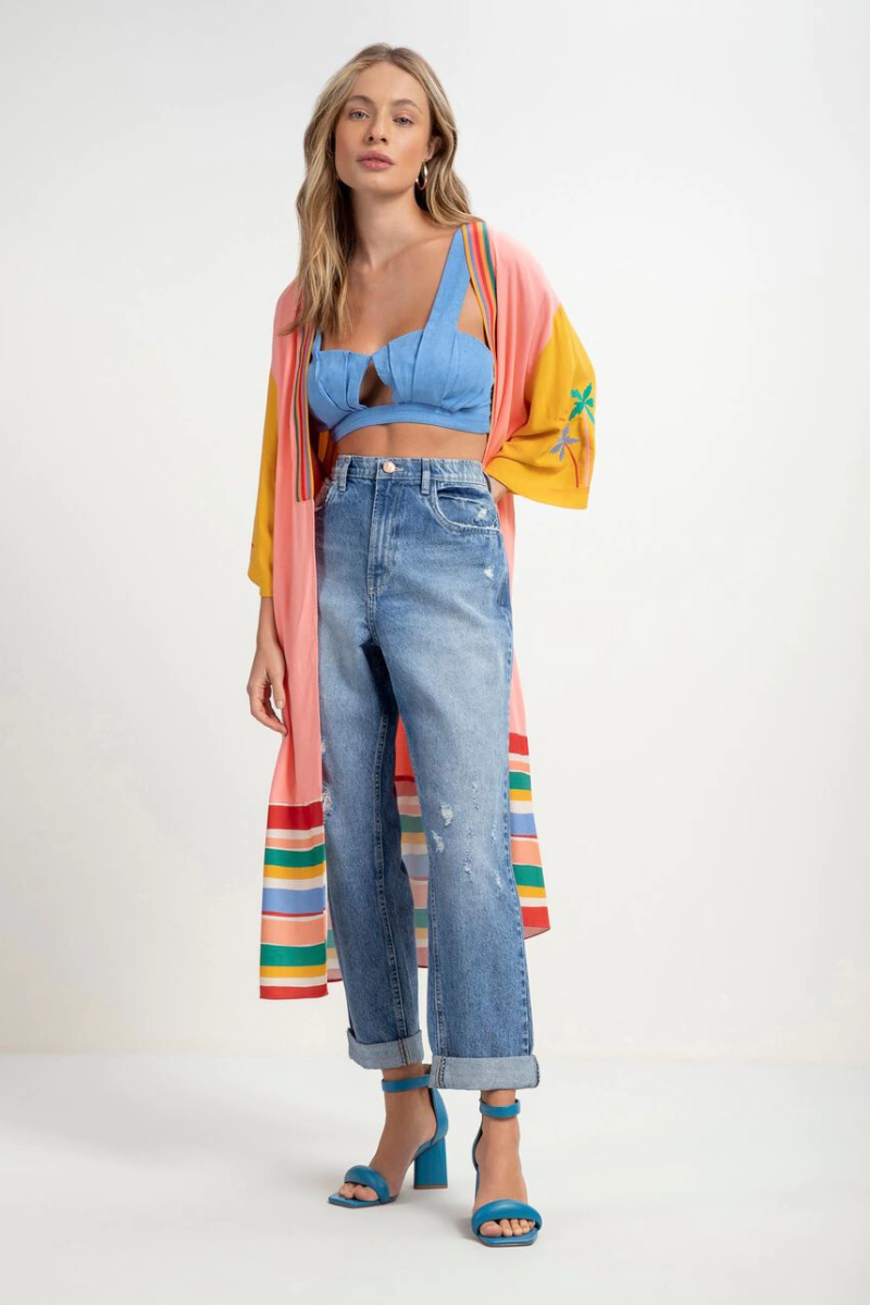 Calça jeans mom com efeito estonado e detalhes destroyed - combo que traz mais modernidade aos looks. A peça possui cintura super alta e shape solto ao corpo que veste perfeitamente, ideal para abusar das sobreposições e looks coloridos. Confeccionada em Jeans